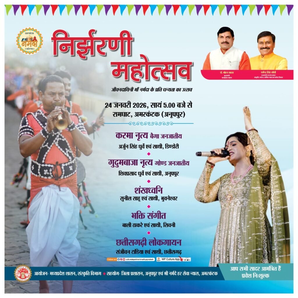 अनूपपुर 22 जनवरी 2026/ मां नर्मदा की पावन जन्म स्थली अमरकंटक में दो दिवसीय माँ नर्मदा महोत्सव-2026 का आयोजन 24 एवं 25 जनवरी 2026 को होगा। महोत्सव में मध्यप्रदेश शासन संस्कृति विभाग के तत्वाधान में तथा जिला प्रशासन अनूपपुर एवं श्री नर्मदे हर सेवा न्यास अमरकंटक के सहयोग से निर्झरणी महोत्सव का आयोजन 24 जनवरी 2026 को शाम 5 बजे से मां नर्मदा के रामघाट में किया जाएगा।