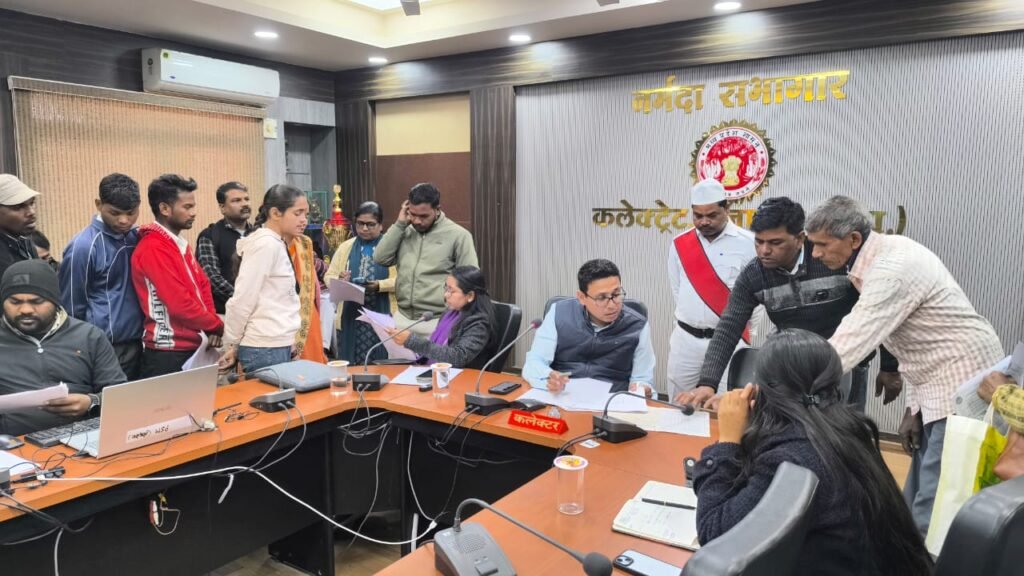 अनूपपुर 13 जनवरी 2026/ जिला स्तरीय जनसुनवाई मंगलवार को कलेक्ट्रेट स्थित नर्मदा सभागार में संपन्न हुई। कलेक्टर श्री हर्षल पंचोली ने 75 आवेदनों पर जनसुनवाई करते हुए संबंधित विभागों के अधिकारियों को निराकरण करने के निर्देश दिए। जनसुनवाई में मुख्य कार्यपालन अधिकारी जिला पंचायत श्रीमती अर्चना कुमारी, अपर कलेक्टर श्री दिलीप कुमार पाण्डेय, डिप्टी कलेक्टर सुश्री प्राशी अग्रवाल सहित विभिन्न विभागों के जिला अधिकारियों ने भी आवेदकों की समस्याएं सुनी।