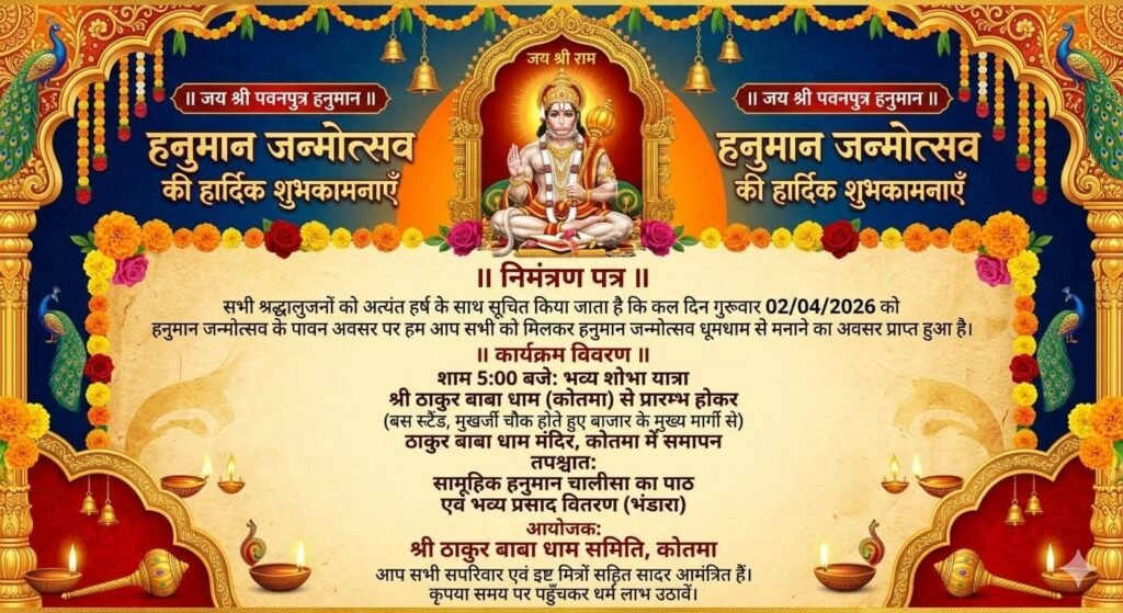 कोतमा। क्षेत्र में भगवान श्री हनुमान जी के जन्मोत्सव को लेकर श्रद्धा और उत्साह का माहौल बन गया है। इसी क्रम में श्री ठाकुर बाबा धाम समिति, कोतमा के तत्वावधान में 02 अप्रैल 2026 (गुरुवार) को हनुमान जन्मोत्सव का भव्य आयोजन किया जा रहा है। इस पावन अवसर पर नगर में विशाल धार्मिक कार्यक्रम आयोजित होंगे, जिनमें बड़ी संख्या में श्रद्धालुओं के शामिल होने की संभावना है।