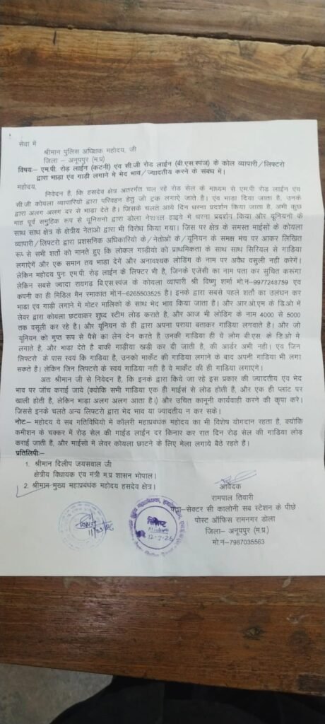 जिले के हसदेव क्षेत्र में कोयला परिवहन को लेकर एक बार फिर विवाद खड़ा हो गया है। एमपी रोड लाइन (कटनी) एवं सीजी कोलियरी के कोयला व्यापारियों द्वारा कराई जा रही ढुलाई में भेदभाव और अवैध वसूली के गंभीर आरोप सामने आए हैं। इस संबंध में स्थानीय ट्रक मालिकों की ओर से पुलिस अधीक्षक अनूपपुर को लिखित शिकायत सौंपकर पूरे मामले की जांच और कार्रवाई की मांग की गई है।
