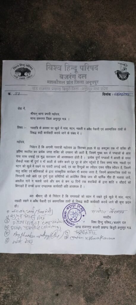 ज्ञापन में प्रमुख रूप से मांग की गई कि नवरात्रि के पावन अवसर पर क्षेत्र में मांस एवं मदिरा की खुलेआम बिक्री पर रोक लगाई जाए। साथ ही, गरबा कार्यक्रमों और दुर्गा पंडालों में भक्ति गीतों का संचालन सुनिश्चित किया जाए, ताकि धार्मिक वातावरण शुद्ध एवं अनुशासित बना रहे।