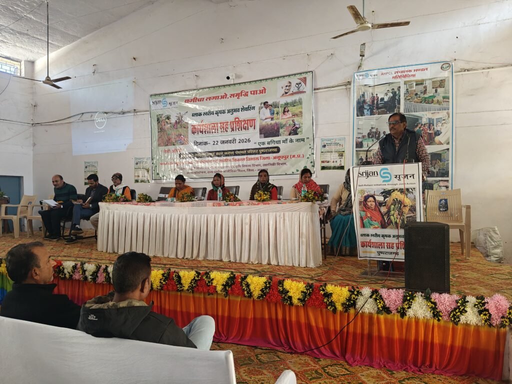 अनूपपुर 22 जनवरी 2026/ मनरेगा योजना अंतर्गत एक बगिया मां के नाम परियोजना के तहत स्वसहायता समूह की महिलाओं को जनपद पंचायत पुष्पराजगढ़ के स्वसहायता भवन में आज बगिया बचाओ, समृद्धि पाओ की थीम पर विकासखण्ड स्तरीय कृषक अनुभव शेयरिंग कार्यशाला सह प्रशिक्षण का आयोजन पंचायत एवं ग्रामीण विकास विभाग एवं सृजन संस्था द्वारा किया गया। जिसमें पौधरोपण, पौधों की सुरक्षा एवं परियोजना में ड्रिप इरिगेशन आदि की जानकारी एवं सुविधाओं का लाभ देने के संबंध में तकनीकी मार्गदर्शन दिया गया। कार्यशाला के दौरान किसानों ने अपने अनुभव साझा किए। बागवानी एवं विकास से जुड़ी तकनीकी जानकारी प्राप्त की तथा भविष्य में आय में बढ़ोत्तरी के अवसरों पर चर्चा की।