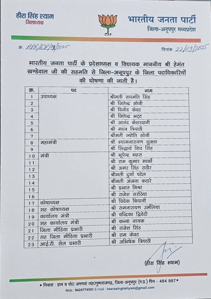 भारतीय जनता पार्टी के प्रदेशाध्यक्ष श्री हेमंत खंडेलवाल की सहमति से भाजपा जिला-अनूपपुर के नए जिला पदाधिकारियों की घोषणा की गई है। इस सूची में कुल 23 पदाधिकारी शामिल हैं।