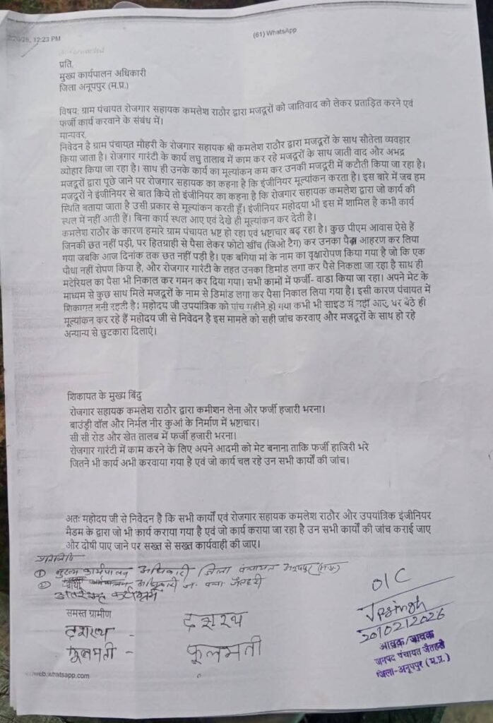 जनपद पंचायत जैतहरी अंतर्गत ग्राम पंचायत मौहरी में महात्मा गांधी राष्ट्रीय ग्रामीण रोजगार गारंटी योजना (मनरेगा) के क्रियान्वयन को लेकर गंभीर अनियमितताओं के आरोप सामने आए हैं। पंचायत के श्रमिकों एवं ग्रामीणों ने रोजगार सहायक एवं संबंधित अधिकारियों पर भ्रष्टाचार, फर्जी मूल्यांकन और योजनाओं में गड़बड़ी के आरोप लगाते हुए निष्पक्ष जांच की मांग की है।